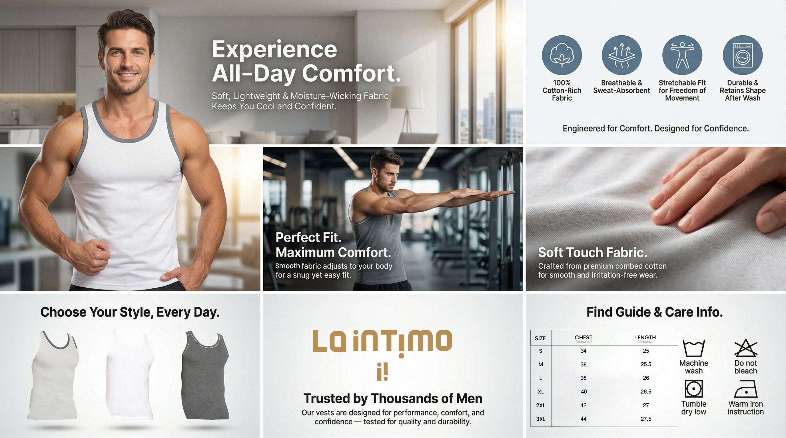 Modern and classic vest styles for men, ideal as a base layer, casual wear, or layering under shirts.